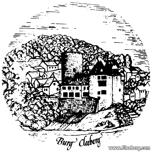 Zeichnung der Burg Cleeberg – Dieses Bild wurde von einem kleinen Wandteller aus dem Schützenhaus in Cleeberg abfotografiert und digital überarbeitet.
